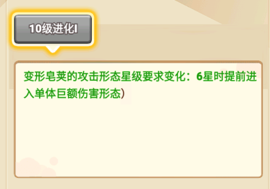 变形皂荚的基础技能是“依据植物星级变换攻击形态”,等级达到10级便能进化。进化后,技能效果变为“变形皂荚攻击形态的星级要求改变:6星时提前进入单体造成巨额伤害的形态” 。