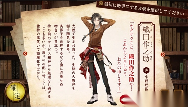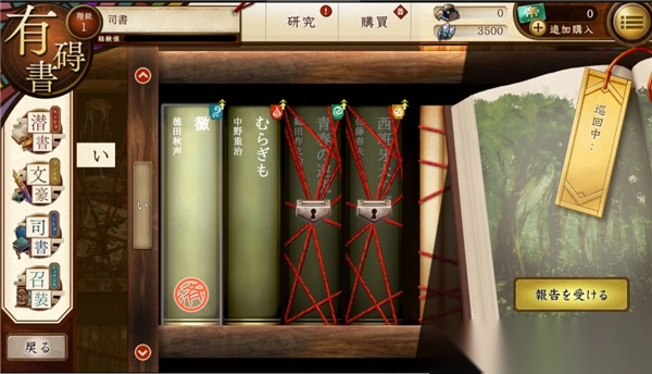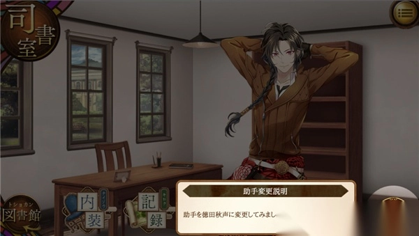 完成初始文豪的选择后,便进入图书馆界面,该界面类似于刀男中的本丸,是游戏的起始界面。管理员的名字会自动采用DMM账号的名字。游戏中的各类按键与按钮均展示在画面上,点击左上角能够隐藏按键。画面右侧的人物为助手,类似于刀男里的近侍,至于近侍的更换,后续在司书室部分会详细说明。右上角的设置按钮可用于调整声音大小,其中第一条“ボイス”指的是人物声音。