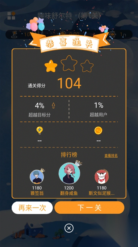 5、一旦你通关,页面便会呈现你的通关得分、排行榜以及超越目标分等各类信息。