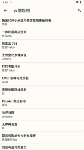 各位,点击右下角的加号,进入云端规则,这里面的规则均由广大网友热心贡献。说到扫码合集,其涵盖了支付宝、微信这类软件中扫一扫、收付款等相关内容。举个例子,长按微信二维码名片,接着点击右下角的勾,就可以将其添加到主页。