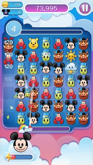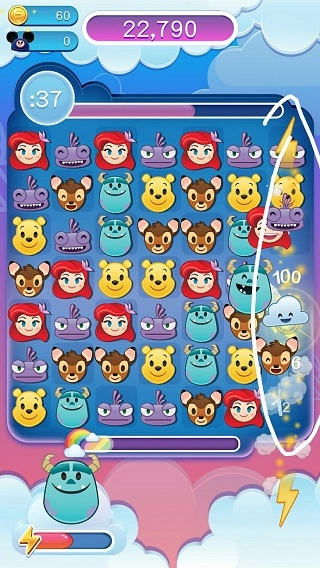2、游戏开始后,和其他游戏类似,滑动使三个相同表情相连即可得分消除。不同的是,若出现四个相同表情相连,会生成带有闪电的云朵,它能消除一整行。