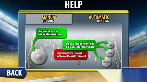 2、游戏开始前,对于那些像小编这样连网球基本规则都不知道的小白玩家,特意准备了系统帮助和训练模式,训练前会为我们展示一些基本的打法。训练的时候还为我们提供了是自动奔跑还是自己控制角色奔跑的选择,使得整个游戏的可玩性大大增加了。