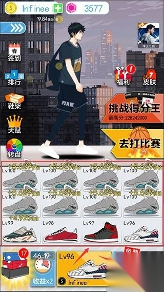 11、在篮球“奥利给”手游里,等级相同的球鞋能够进行合成,合成后得到的更高等级球鞋具备更高的分数加成,而且球鞋还会持续不断地为玩家带来金币收益。