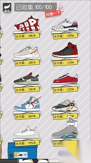 7、点击主界面左侧的鞋架功能,你目前收集到的所有球鞋便会呈现出来,总共有100种,宛如一个小型展览馆。
