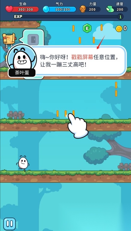 2. 手指点击的地方就是你的茶叶蛋英雄跳跃落点,尽量收集金币!