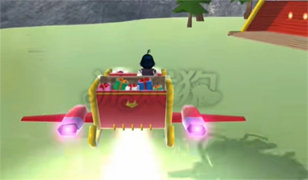就在圣诞小屋门口摆着,升到高空以后就能飞行了,这个雪橇有一个攻击键,可以用来攻击,点击就会发送大量的圣诞礼物。