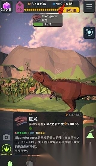 4、屏幕顶部是任务,为玩家提供"收集25个剑龙","升级3个特征"和"照片始祖龙"等目标。一次显示三个任务,每个等级都需要完成更多的任务才能进入下一个级别。任务完成后,玩家将获得一个包含诱变剂和特质卡的石头大地。