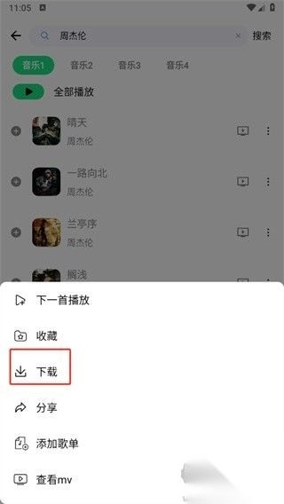 4、最后点击过后会弹出下一首播放、收藏、下载、分享、添加歌单、查看mV选择,我们点击【下载】即可;