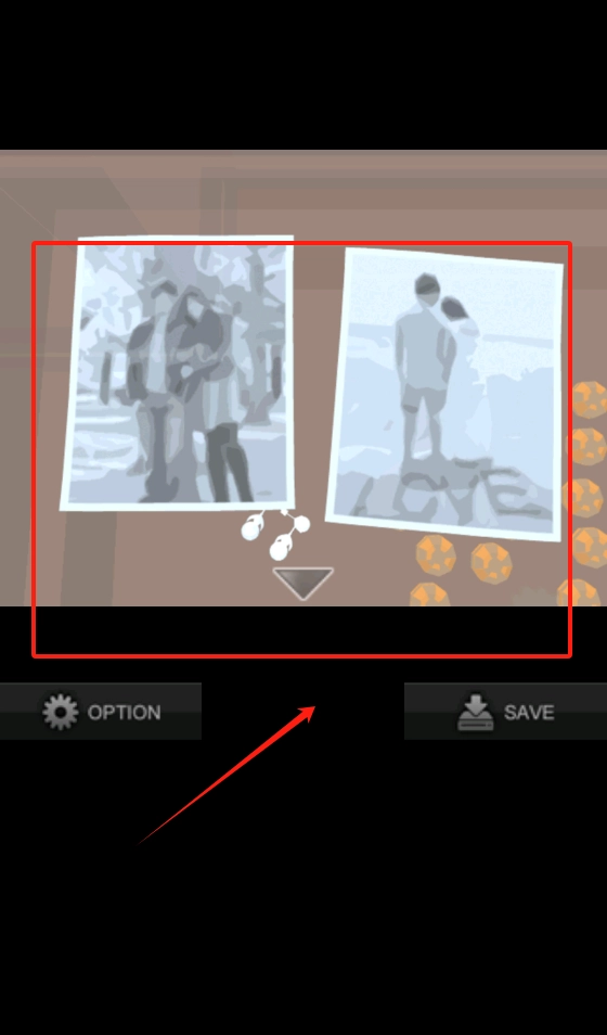 3、两张黑白照片被红框框住,点左下OPTION调设置,右下SAVE存档,拖动照片可能触发隐藏剧情。