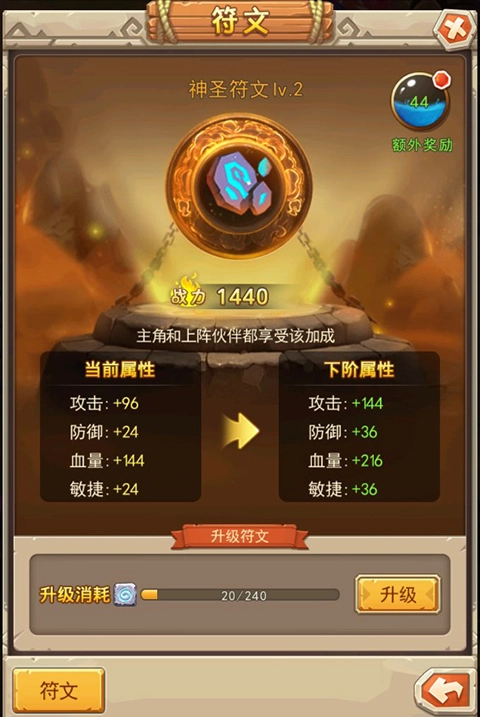 3、符文:能给予额外的属性加成,提升主角与伙伴的战力。玩家可通过闯关并领取通关奖励的方式,来提高符文等级。