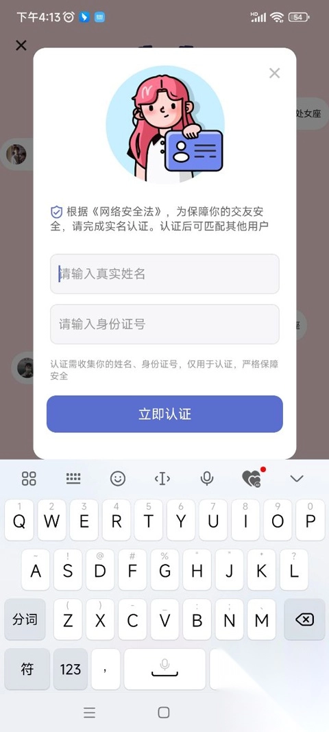 3、开启聊天需进行实名认证,请输入姓名和身份证号完成认证。