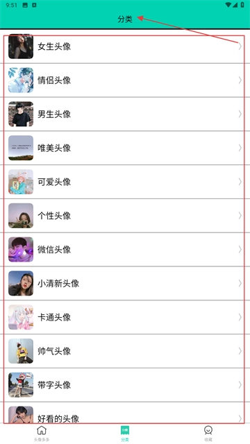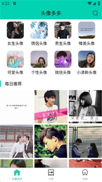 3、进入【分类】页面,根据自身需求,点击【女生头像】【情侣头像】等分类,以实现精准查找头像。