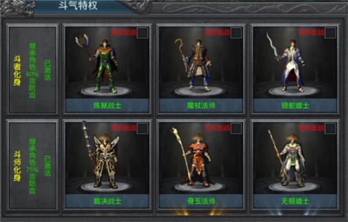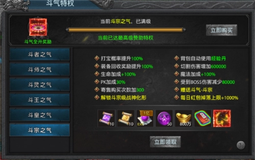 可消耗钻石购买斗气赞助等级,获得自动回收、战神化形以及属性提升等特权!安心挂机,快人一步!