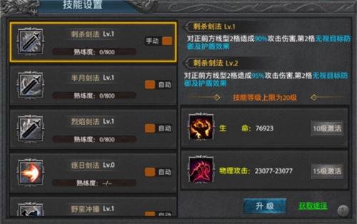战士拥有刺杀剑法、半月剑法、烈焰剑法、逐日剑法、野蛮冲撞、无情怒冲、龙爪手、护体罡气、魔法盾、星陨火雨、十步一杀、施毒术、火龙召唤技能。