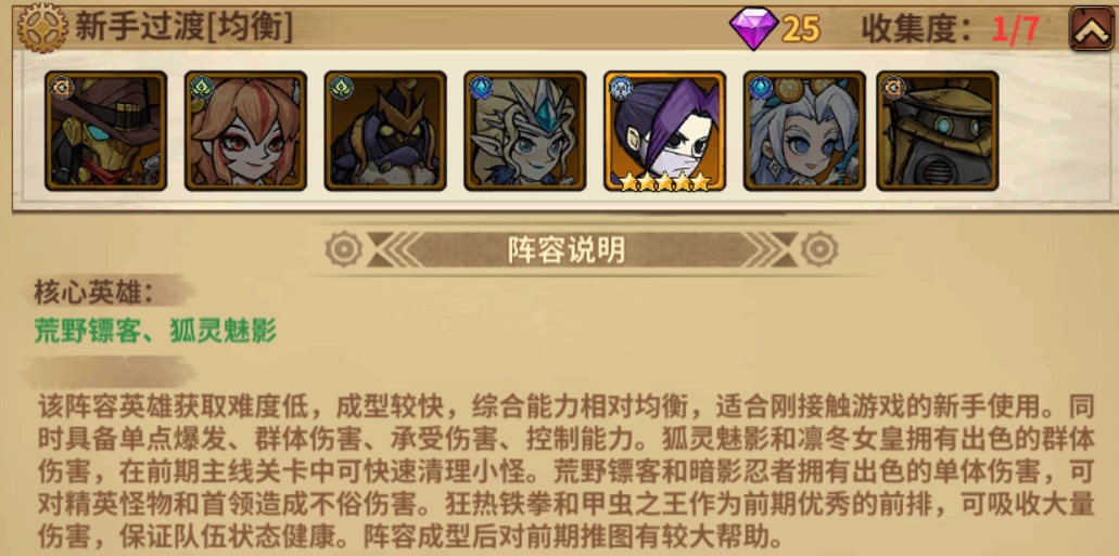 3、阵容介绍:此阵容的英雄获取难度不高,成型速度较快,综合能力较为均衡,很适合刚接触游戏的新手玩家选用。该阵容同时具备单点爆发、群体伤害、承受伤害以及控制能力。其中,狐灵魅影与凛冬女皇有着出色的群体伤害能力,在前期主线关卡里能够迅速清理小怪。荒野镖客和暗影忍者则拥有突出的单体伤害,面对精英怪物与首领时可造成可观的伤害。狂热铁拳和甲虫之王作为前期优质的前排角色,能够吸收大量伤害,确保队伍状态良好。阵容一旦成型,对前期推图助力颇大。