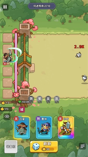 2、进入关卡后点击刷新可以召唤武将来战斗,每次会随机刷新三个武将让你选择一个。
