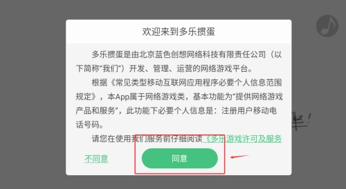1. 初次启动时,需阅读并确认用户协议,点击“同意”按钮方可进入游戏大厅界面。