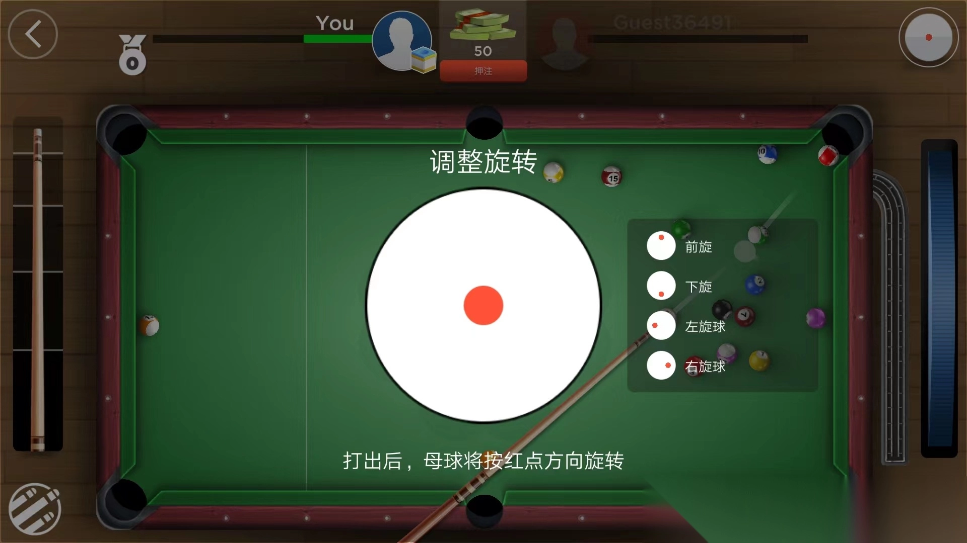 4、我们可以通过调整旋转,来控制母球旋转的方向,