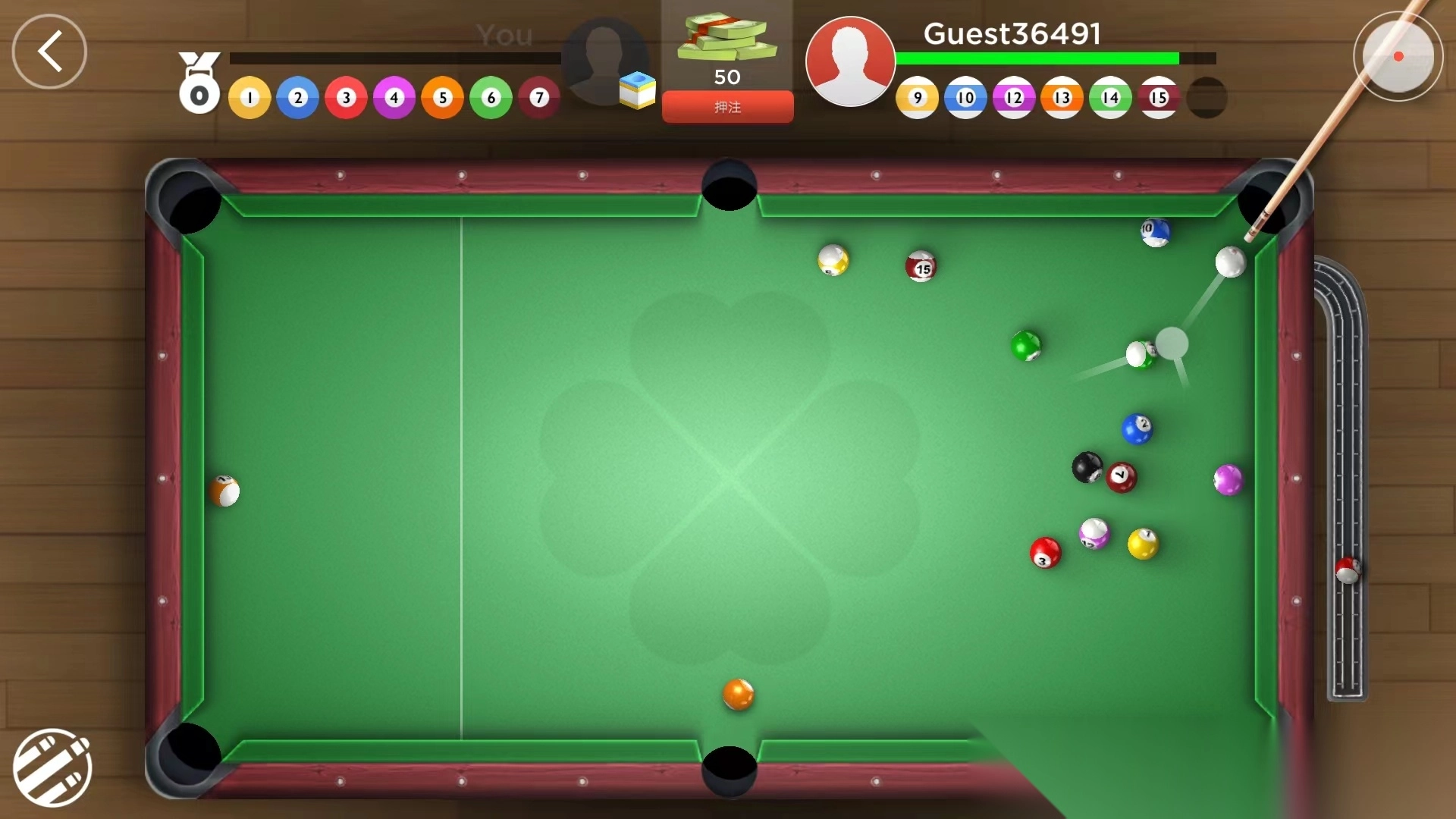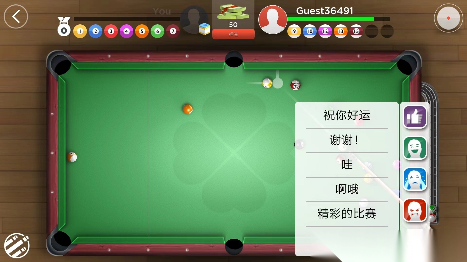 3、开球完成后,双方需要打进不同的球色,左上方为己方,右上方为对手,