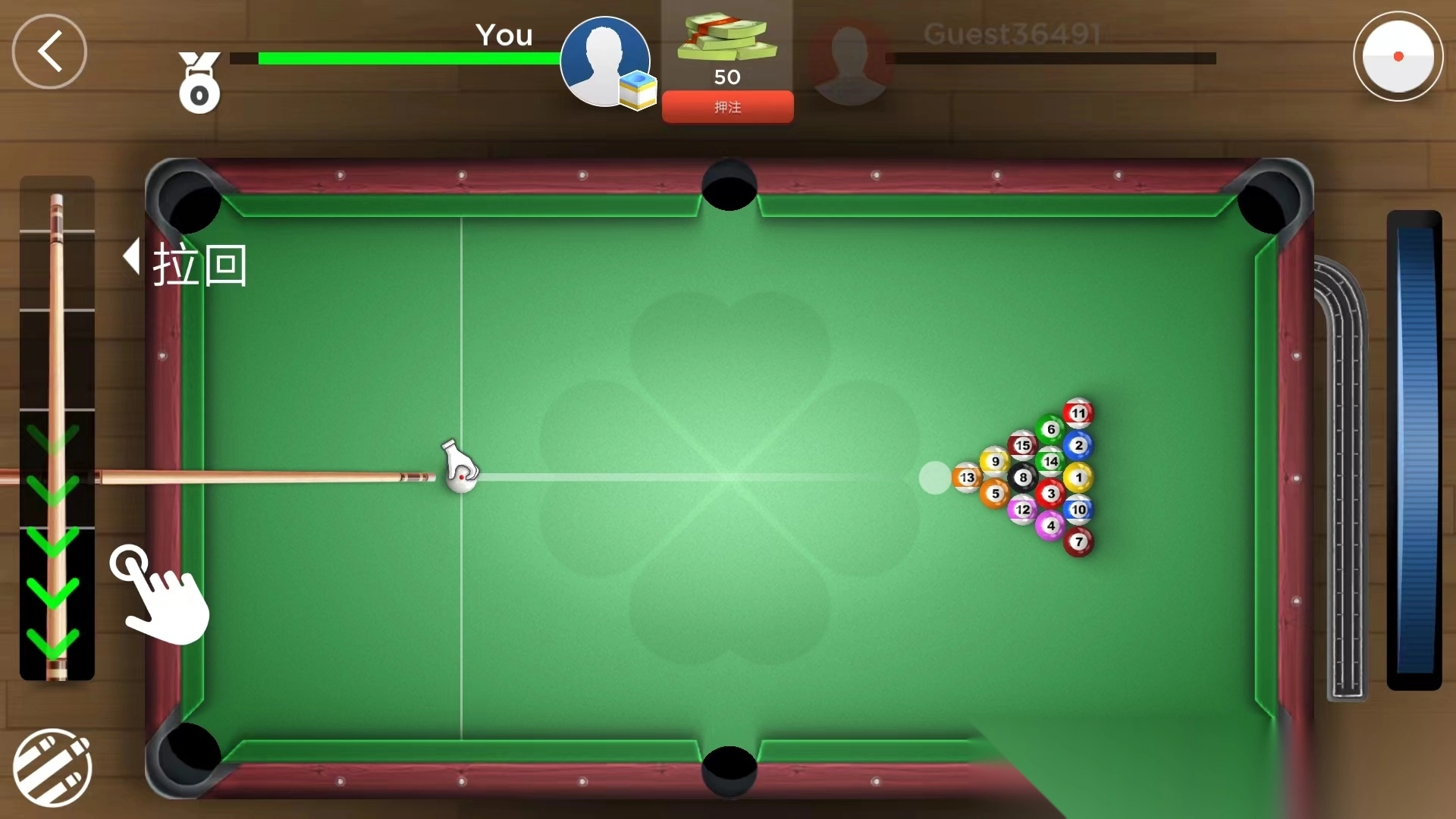 2、进入游戏对战界面,我们可以通过左边的球杆往下拉回调整力度,