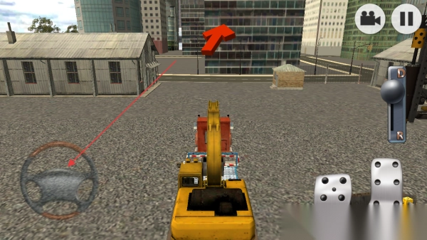2、在工地场景,通过操控方向盘、按钮等,驾驶挖掘机移动,按箭头指引完成施工任务。