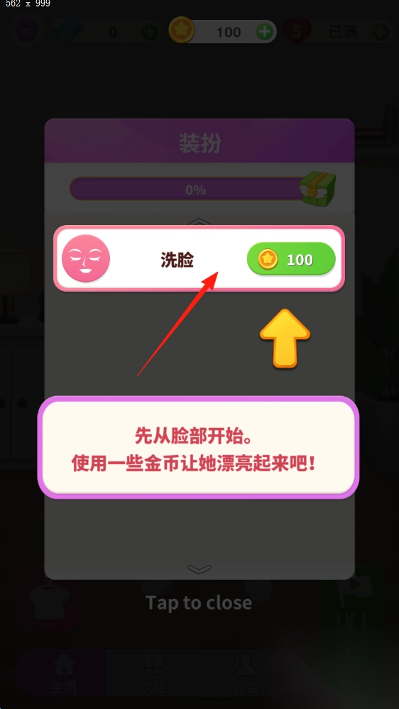 1. 来到装扮界面,轻点“洗脸”选项,花费100金币,迈出角色变美的第一步。