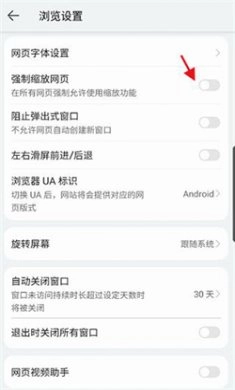 4、进入浏览设置,找到下方的强制缩放网页,点击右侧的按钮开启此功能