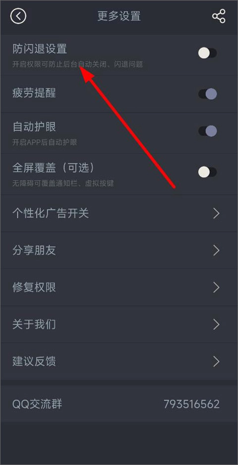 3、进入更多设置页面,用户能够开启权限设置中的防闪退、疲劳提醒、自动护眼以及全屏覆盖等功能,完成设置后退出,相关设置便会自动保存。