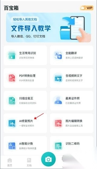 1、下载完成后打开并进入app,点击“百宝箱”,其中包含众多功能,点击选择“AI修复照片” 。