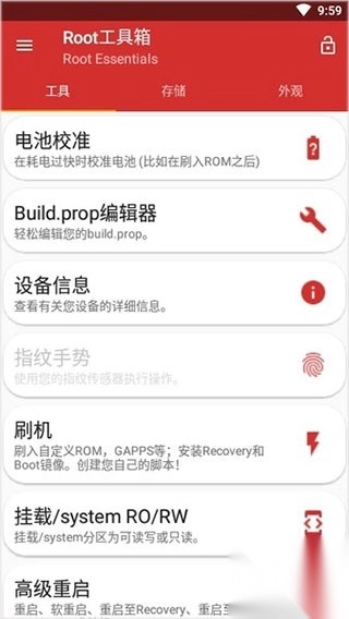 1、首先打开Root工具箱,在工具模块,我们可以使用电池校准、刷机、高级重启等功能;