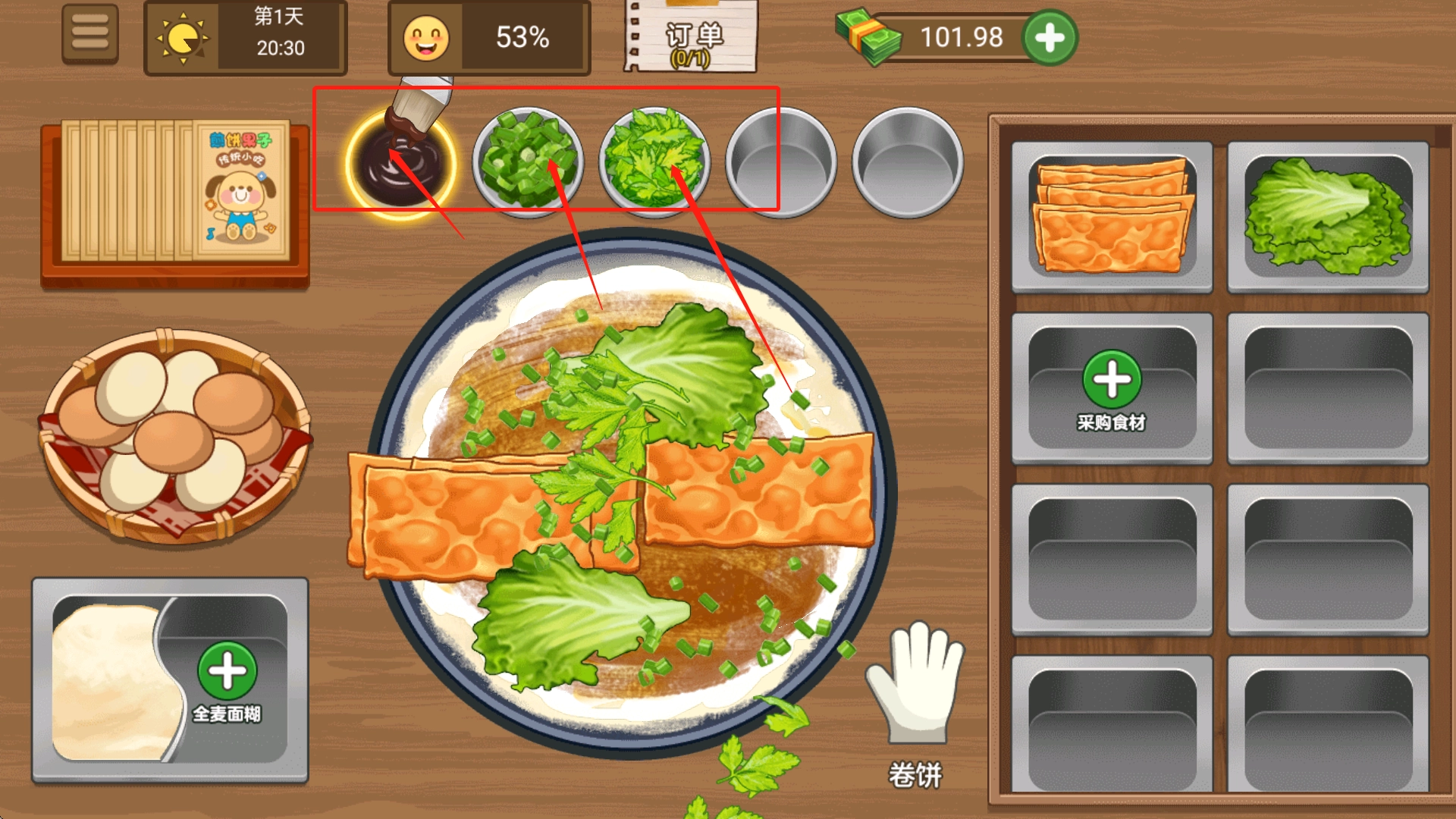 3、依次放入薄脆和生菜,根据买家要求放入小料,全部放好后点击卷饼即可制作完成。
