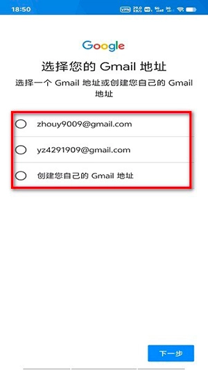 4、然后选择您的 Gmail 地址,系统会生成两个,也可以自己创建,根据个人习惯来吧,点击“下一步”;