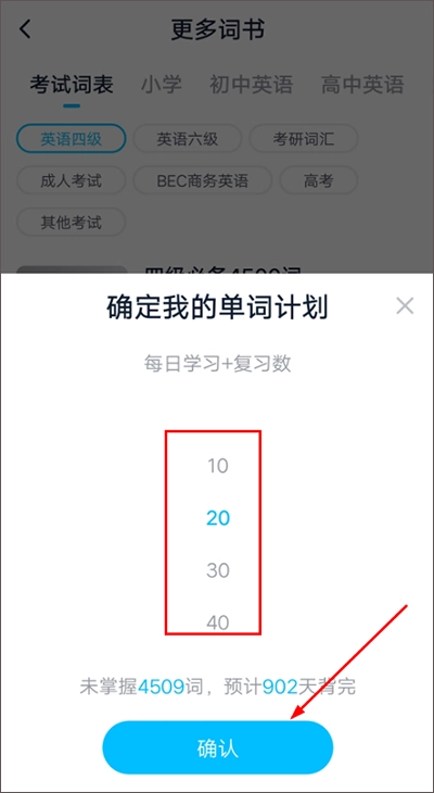 2、在【更多词书】页面内,根据自己的需求来选择要背的单词量