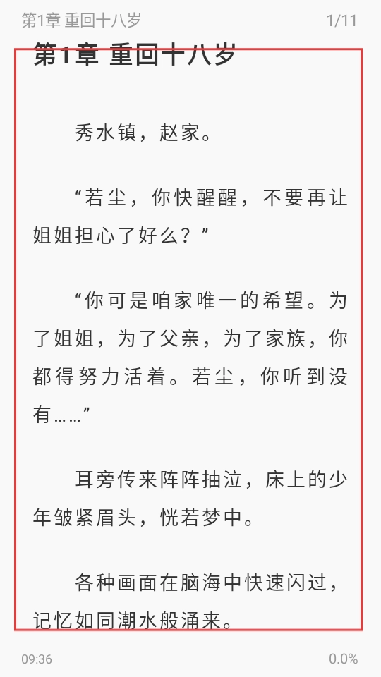 2. 在阅读页面,能够阅读第一章的内容,轻触屏幕即可唤起菜单功能。