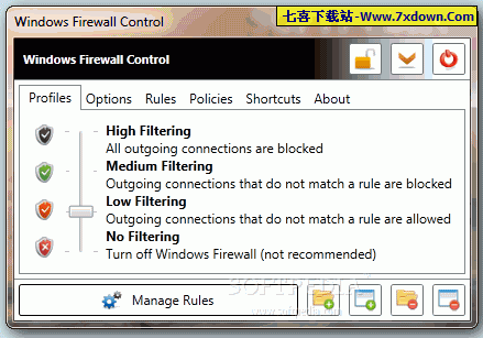 使用方法,支持高过滤、中过滤、低过滤、无过滤四种配置文件!允许你一键就可以轻松设定过滤规则!它主要用于扩展 Windows 内原生自带的防火墙。通过 Windows Firewall Control 用户可以轻松控制使用最频繁的 Windows 防火墙选项,而无需再通过控制面板去找“防火墙”选项。