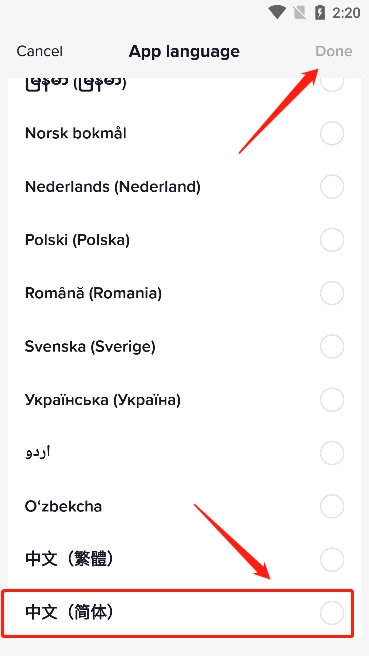3、最后直接翻至最下方,选中中文简体,点击右上角的“done”,即可修改为中文。