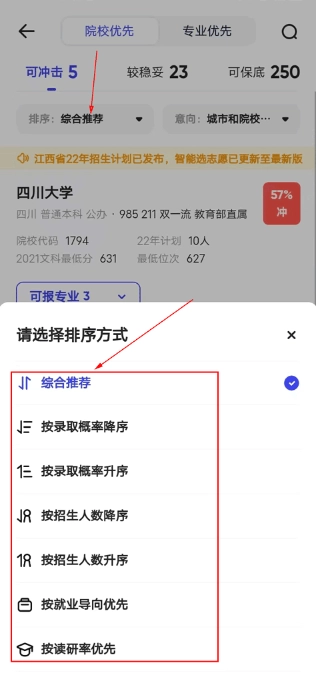 6、接着点击排序,此时会呈现出以下几种排序方式:综合推荐、按录取概率降序、按录取概率升序、按招生人数降序、按招生人数升序、按就业导向优先、按读研率优先。