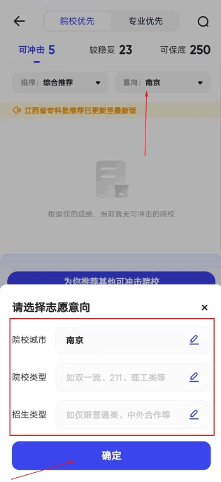 7、最后点击“意向”,在相应位置填写你想去的城市。随后系统会依据你的分数,为你查询该城市你能够填报的学校。填完校园类型和招生类型后,点击“确定”。