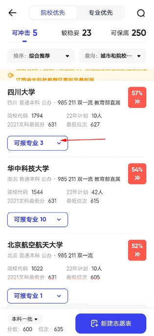 8、接下来就能浏览契合你的大学啦,在此能够筛选出具有冲击性、较为稳妥以及可作为保底的学校,并且还能点击可报专业,查看专业相关信息。