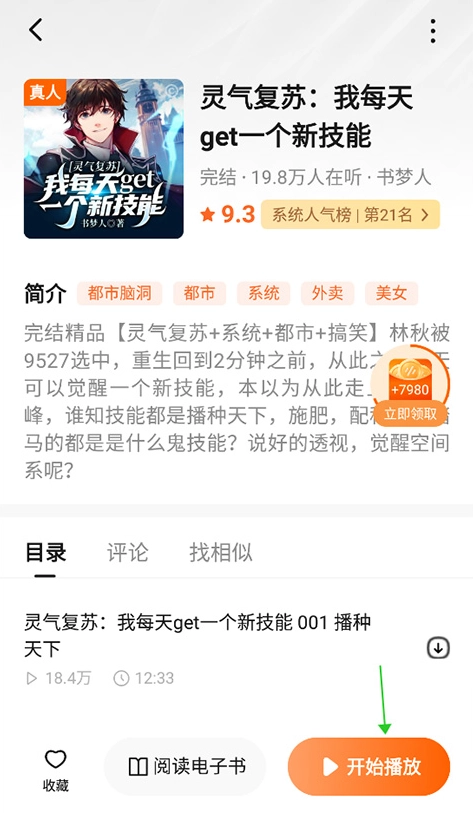2. 在小说详情页面,点击右下角的【开始播放】,即可开启听书模式。