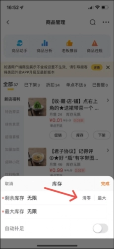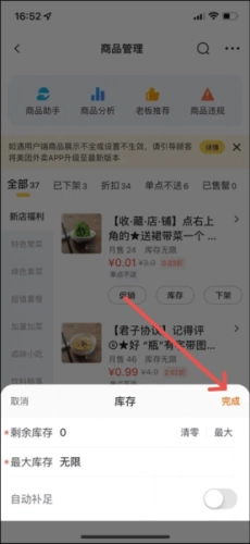 3、进入该商品的库存编辑界面,找到剩余库存,点击其后的清零按钮,将剩余库存从无限库存调整为零库存,随后点击“完成”。