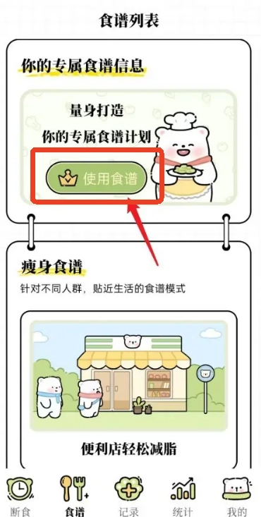 3、于所选的食谱卡片里,点击【使用食谱】按钮,就能把该食谱启用为当日的饮食计划。启用之后,系统会自动记录食谱的状态,以便后续进行跟踪与管理。
