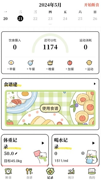 4、用户点击“记录”板块,即可快速记录每天的摄入情况。