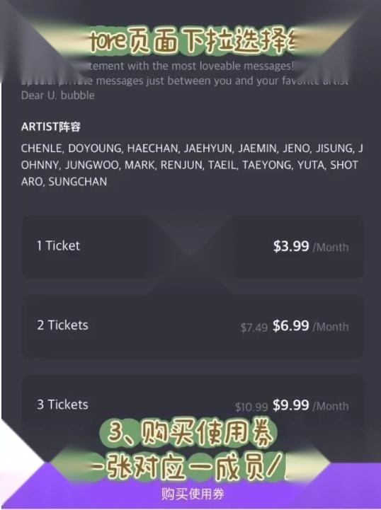 4、成员选择仅支持按组合进行,不可跨团操作。依我理解,一张券仅能用于订阅一位艺人一个月,不支持一次性订阅多个月。