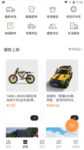 2、点击“好物”,其内容展示了最新车型、服饰装配、维保配件等功能,此处能为喜爱越野的用户提供越野用品购买服务。