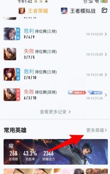当进入战绩界面之后,向下滑动页面,从而找到常用英雄。
