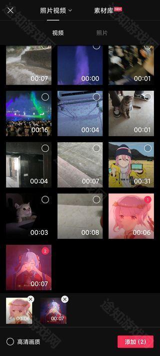 2、打开照片视频界面或者素材库,勾选至少两段视频作品,然后点击“添加”