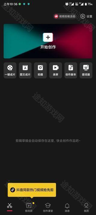 1、想要添加转场效果时打开剪映首页,然后点击“开始创作”。