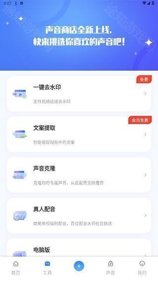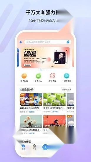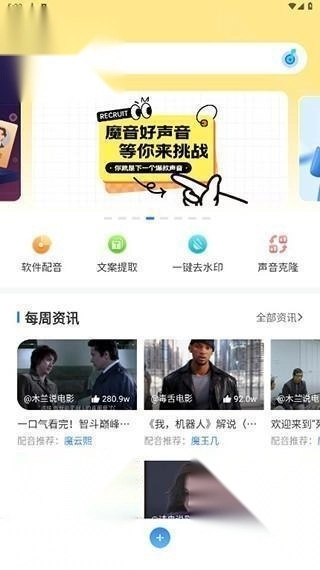 用户轻点下方的首页,就能使用软件的配音、文案提取、一键去水印、声音克隆等诸多功能,同时还能观赏到有趣且魔性的配音视频。