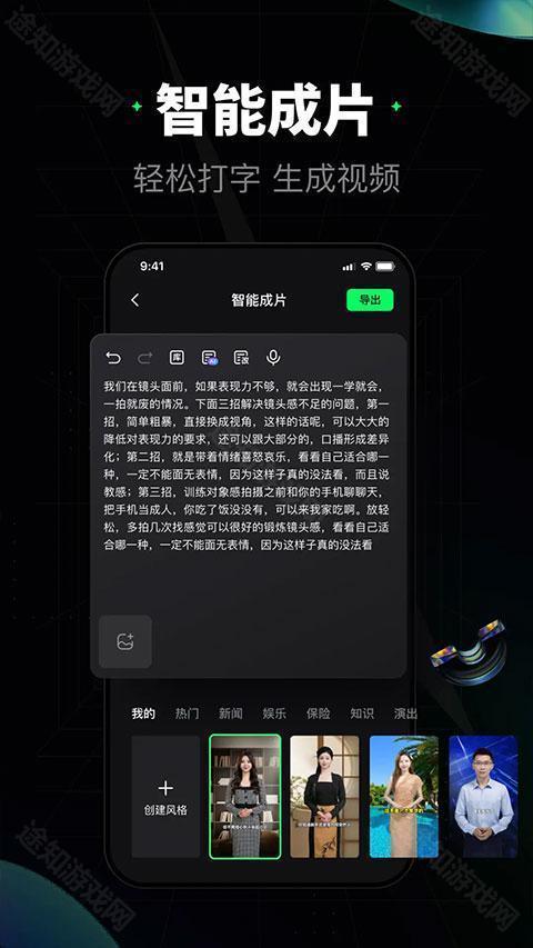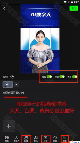 4、完成选择后,对文案、背景及标题进行编辑。软件会依据你输入的文案,与数字人台词进行匹配。全部操作完成后,点击“导出”,就能完成视频制作。